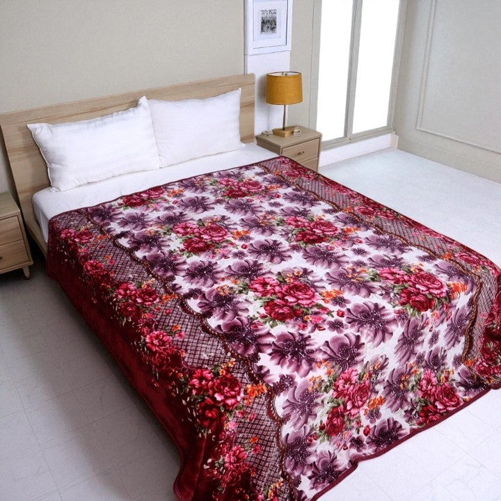 Let your nights bloom with Bloomhaven, a printed AC blanket designed to bring floral serenity and breathable comfort to your space. Crafted for warmer climates and air-conditioned rooms, this lightweight blanket features a vibrant garden of blossoms—red, pink, and violet florals dancing across a crisp white canvas, bordered with rich burgundy accents.
