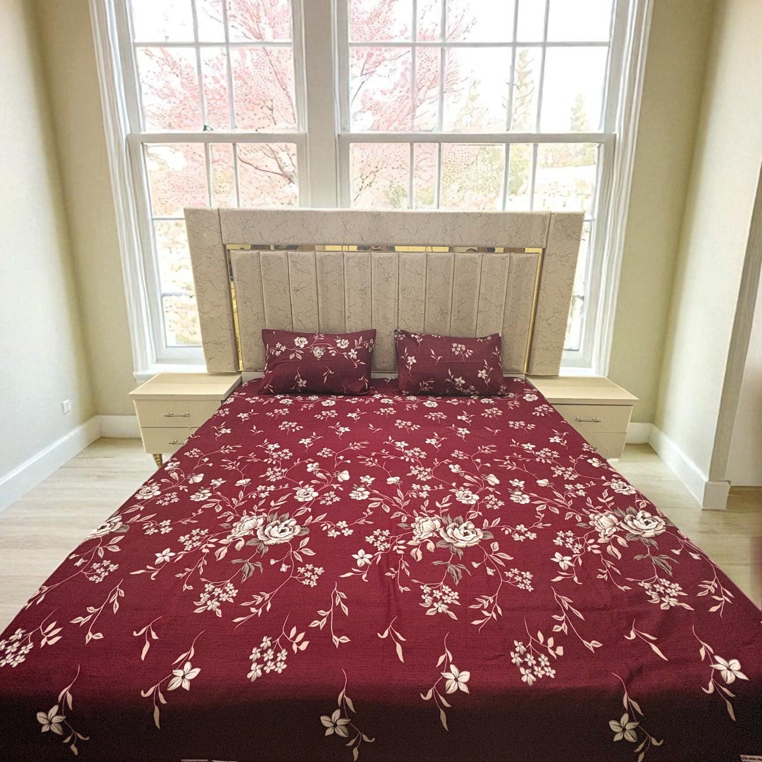 Surround yourself with the softness of Bloomveil, where plush microfiber comfort meets artistic elegance. This premium bed sheet set features a romantic floral motif with cascading rose blossoms in shades of blush, crimson, and ivory—perfectly composed against a soft pink canvas. Tailored for everyday indulgence, Bloomveil is lightweight, fade-resistant, and effortlessly breathable, making each sleep feel like a gentle embrace.