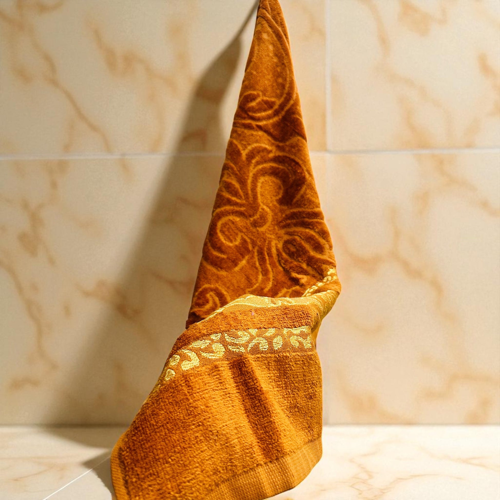 Its gentle peach hue and delicate golden detailing evoke a sense of calm and refinement, while the textured folds add visual depth to your space. Whether hung with grace or folded with intention, Havenloom brings a touch of artistry to your bathroom sanctuary.