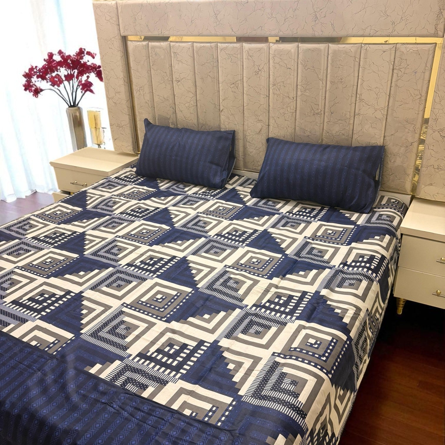 Premium Cotton 3 Pcs Bed Sheets King Size - Blue Grid